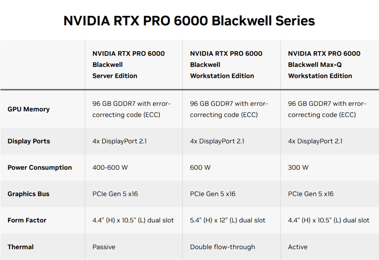 Unlike NVIDIA HGX's rack-mounted server platforms, the NVIDIA RTX PRO 6000 Blackwell series is primarily designed for desktop PCs, workstations, and multi- GPU servers, allowing professional users to flexibly configure the required equipment based on their needs. It is available in Workstation Edition, Max-Q Workstation Edition, and Server Edition.