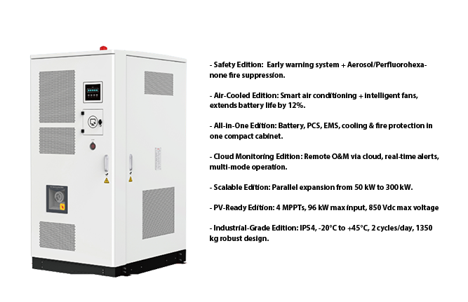 The HE25-50T110 is an All-in-One intelligent energy storage system featuring 50kW PCS, 110kWh LFP battery, air-cooling, and cloud-based EMS. Designed for fast deployment, safe operation, and scalable expansion, it supports parallel connection from 50kW to 300kW to meet diverse power needs across industries.
